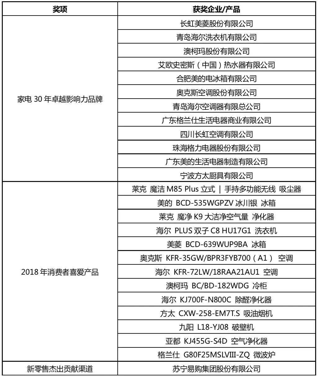 (家电30年卓越影响力品牌奖获奖企业)
